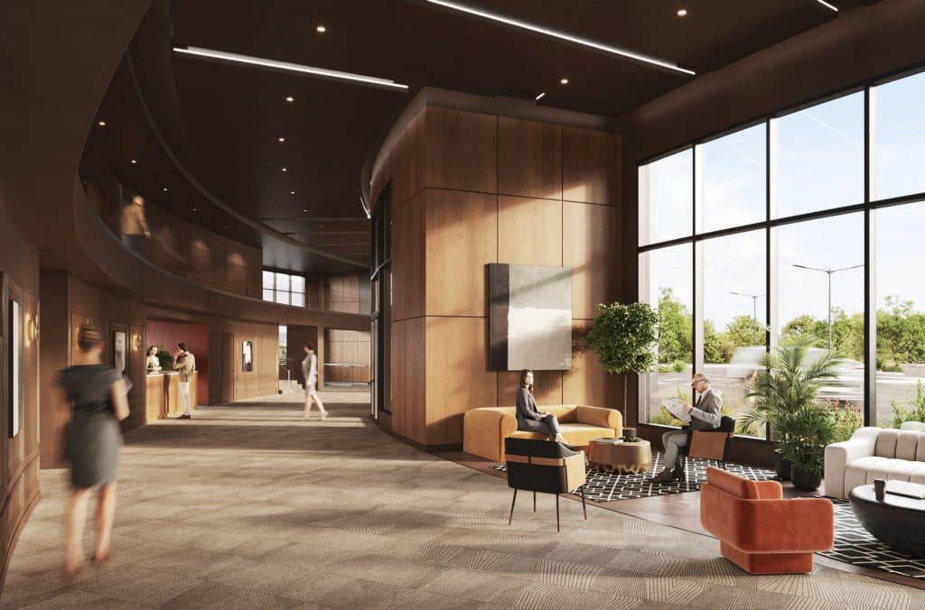The round-about driveway will feature a commissioned stainless steel sculpture designed and created by local artists Darren Sakwi and Gerry Gyles. The exterior pattern and ombre effect of the modular wall panel system, with the glow of the yellow feature ribbon, as well as carefully considered landscaping, create a welcoming exterior which sets the tone for the unique design offering that greets tenants and guests alike with a feeling of “You Have Arrived!” as they enter the building. We strive to create an ambiance for heartfelt conversations and exchanges of ideas and a space that complements the human experience.